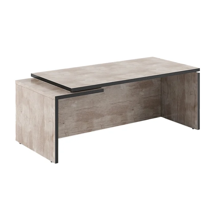 Солидный и большой рабочий стол руководителя TORR для офисного или домашнего использования, размер - 1800х900х750 мм, тип – левосторонний, цвет – Дуб Каньон. Оснащен надежными и долговечными опорами увеличенной ширины из ЛДСП 38 мм, которые расположены по краям стола. Между столешницей и опорами установлены специальные проставки, что создает эффект «парящей столешницы». Солидная и прочная столешница 38 мм. Все торцевые поверхности основных элементов стола облицованы глянцевой акриловой кромкой 2 мм с декоративными полосками внутри кромки, что придает ей стильный 3D эффект. Торцы дополнительных элементов надежно защищены кромкой ПВХ 2 мм. Конструкция стола оснащена прочными силовыми креплениями – эксцентриковыми стяжками. Регулируемые по высоте опоры обеспечат столу устойчивость на неровном полу.