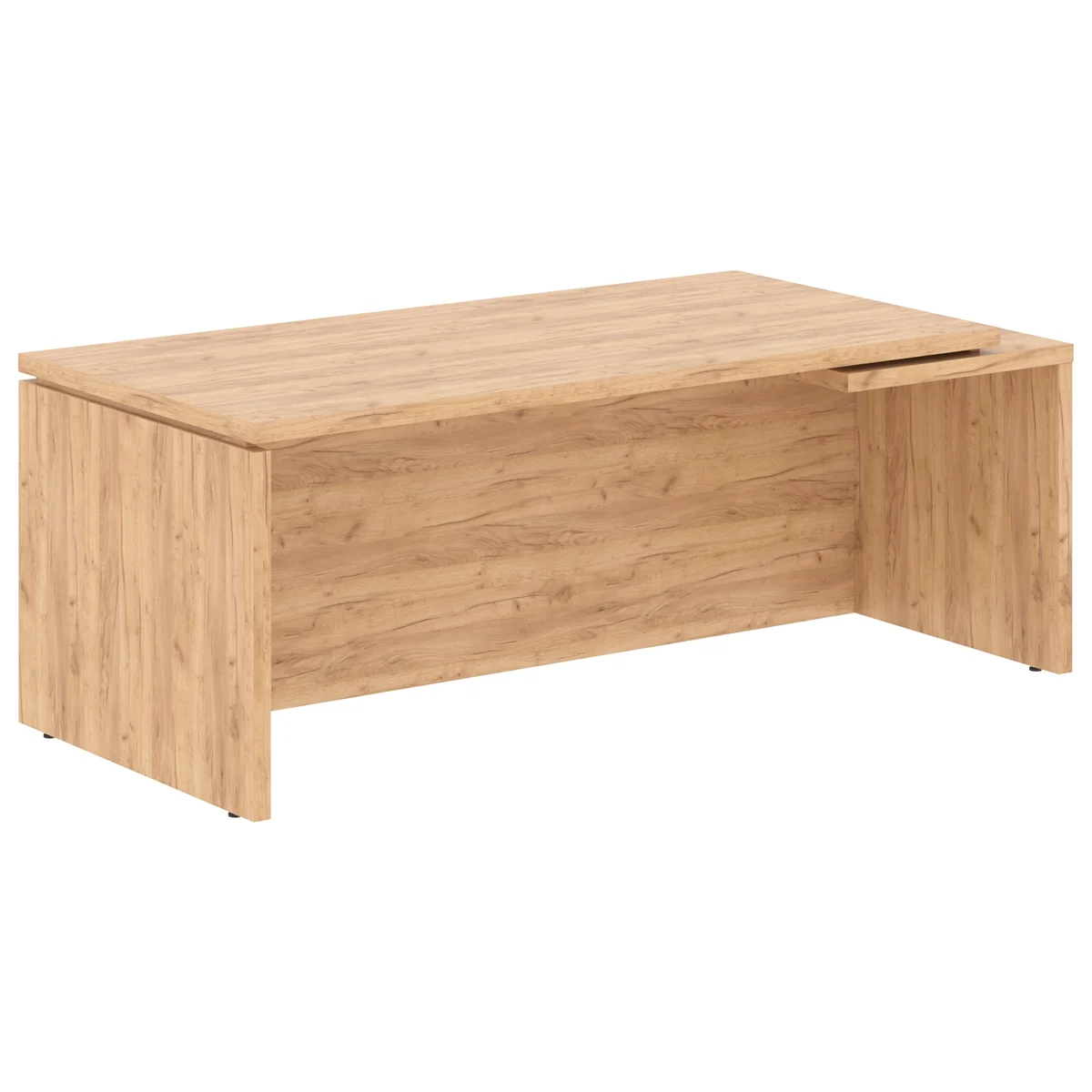 Солидный и большой рабочий стол руководителя TORR-Z для офисного или домашнего использования, размер - 2000х900х750 мм, тип – правосторонний, цвет – Дуб Девон. Оснащен надежными и долговечными опорами увеличенной ширины из ЛДСП 38 мм, которые расположены по краям стола. Между столешницей и опорами установлены специальные проставки, что создает эффект «парящей столешницы». Солидная и прочная столешница 38 мм. Все торцевые поверхности элементов стола надежно защищены кромкой ПВХ 2 мм. Конструкция стола оснащена прочными силовыми креплениями – эксцентриковыми стяжками. Регулируемые по высоте опоры обеспечат столу устойчивость на неровном полу.