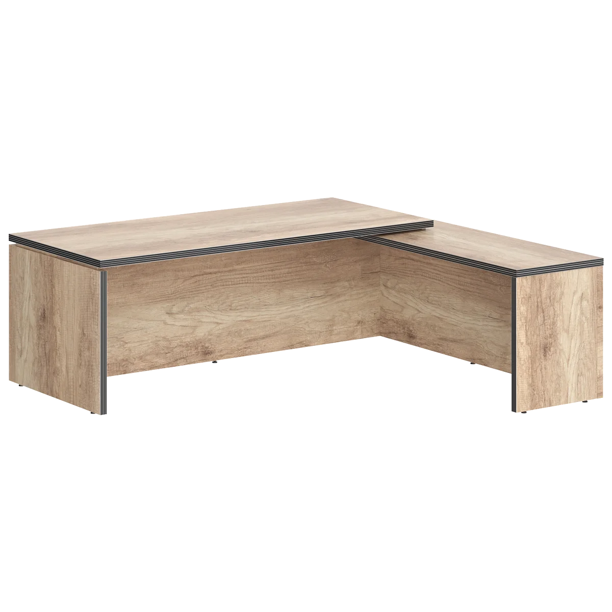 Большой угловой рабочий стол руководителя TORR для офисного или домашнего использования, размер - 2200х2000х750 мм, тип - правосторонний, цвет – Дуб Каньон. Оснащен надежными и долговечными опорами увеличенной ширины из ЛДСП 38 мм, которые расположены по краям стола. Между столешницей и опорами установлены специальные проставки, что создает эффект «парящей столешницы». Солидная и прочная столешница 38 мм. Все торцевые поверхности основных элементов стола облицованы глянцевой акриловой кромкой 2 мм с декоративными полосками внутри кромки, что придает ей 3D эффект. Торцы дополнительных элементов надежно защищены кромкой ПВХ 2 мм. Конструкция стола оснащена прочными силовыми креплениями – эксцентриковыми стяжками. Регулируемые по высоте опоры обеспечат столу устойчивость на неровном полу.