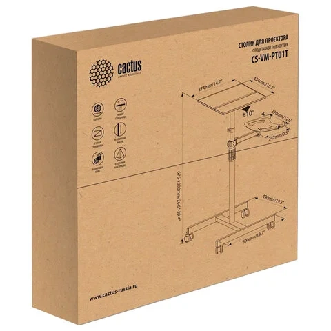 Стол для проектора CS-VM-PT01T с подставкой под ноутбук обладает устойчивой конструкцией с возможностью регулировки высоты от 675 до 1 000 мм. Блокировка колесиков позволяет удобно разместить столик CACTUS в помещении и зафиксировать его положение, а функция наклона столешницы составляет примерно от -10° до +10°, что обеспечивает комфорт для более детальной настройки. Дополнительная площадка для ноутбука имеет ограничители, предотвращающие случайное падение техники. Также у стола есть держатель для прокладки проводов и эластичный ремень для фиксации проектора
