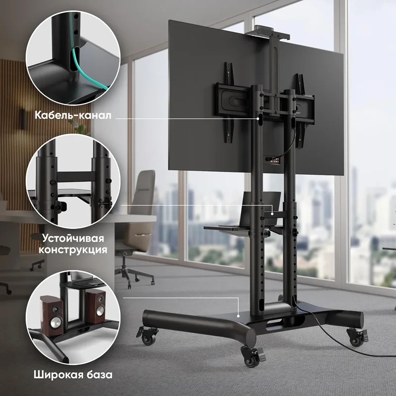 Легкая и удобная сборка и установка не требует особых навыков, собрать мобильную стойку и установить телевизор не составит особого труда. При необходимости стойку с кронштейном можно разобрать и собрать заново - это придется кстати для проведения выездных конференций.