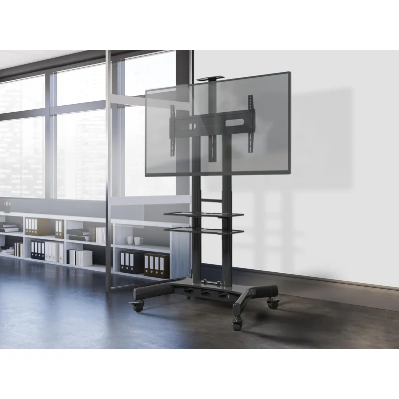 Если Вы ищите стенд с колёсами для большого, или не очень, телевизора, но при этом необходимо разместить всё на достаточно ограниченном пространстве, допустим в конференц-зал, переговорную, в свой кабинет, в выставочный зал, ресторан или кафе, то Мобильная стойка Onkron TS1881 одно из самых лучших решений. Выполнена из сверхпрочной стали, на неё нанесено качественное чёрное порошковое покрытие, что придаёт ей ещё большей превлекательности во внешнем виде. А две надёжные вертикальные трубы, дополнительно усиленные по центру и регулирующиеся по высоте от 1350мм до 1650мм, позволят Вам установить на стойку телевизор весом до 90.9кг, и диагональю до 80 дюймов и без особых усилий подкорректировать его положение по вертикали.