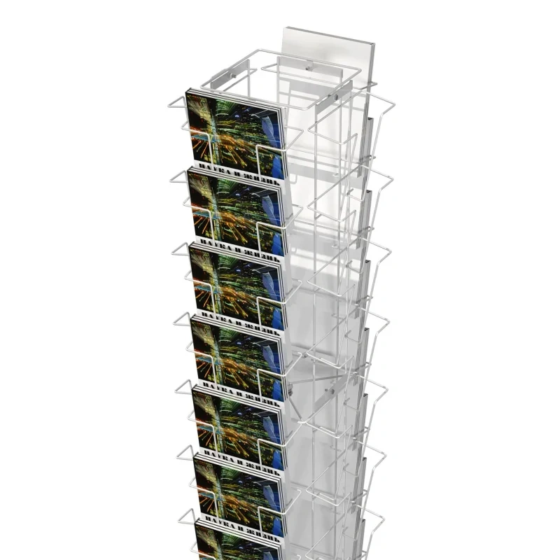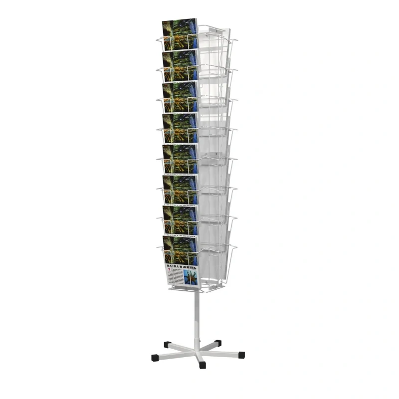 Данная стойка предназначена для презентации и реализации печатной продукции (открытки, буклеты, рекламная полиграфия). Рекомендуется размещать конструкцию в центре зала или около кассы.