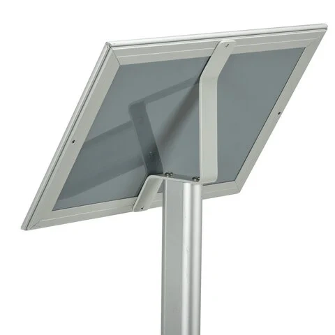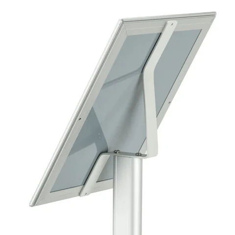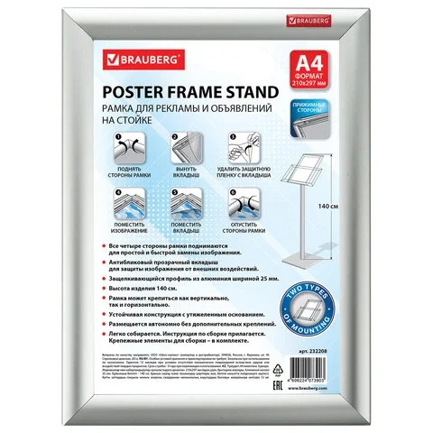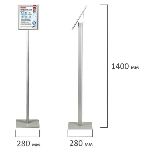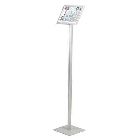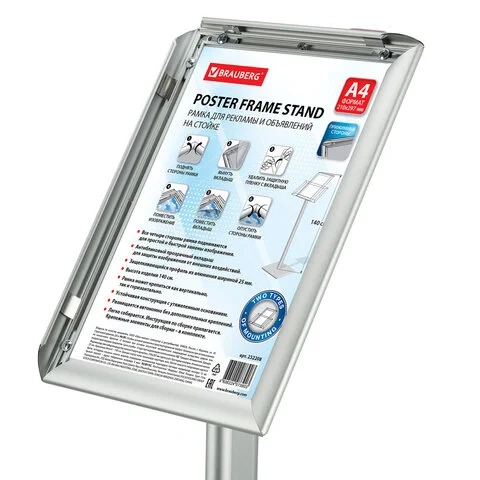 Предназначен для размещения листовки формата А4 (21х29,7 см). Рамка и стойка изготовлены из алюминия. Общая высота составляет 140 см. Ширина профиля - 25 мм. Рамка может крепиться как вертикально, так и горизонтально, оснащена антибликовым прозрачным вкладышем из ПВХ для защиты изображения. Для того, чтобы заменить листовку, достаточно поднять прижимные стороны рамки, вынуть защитный вкладыш и вставить новое изображение. Утяжеленное основание обеспечивает отличную устойчивость. Размещается автономно, без дополнительных креплений.