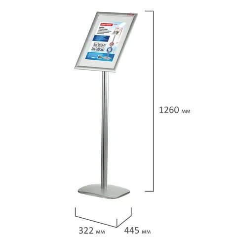 Профиль рамки и стойка изготовлены из анодированного алюминия. Возможность горизонтального и вертикального крепления рамки. Благодаря прозрачному антибликовому покрытию документы отчётливо видны посетителю, не мнутся и не загрязняются в течение всего эксплуатационного периода. Утяжеленное основание обеспечивает надежную устойчивость. Максимальная высота вставляемого листа - 420 мм, максимальная ширина вставляемого листа - 297 мм. Общая высота - 1 260 мм. Цвет рамки - матовое серебро.