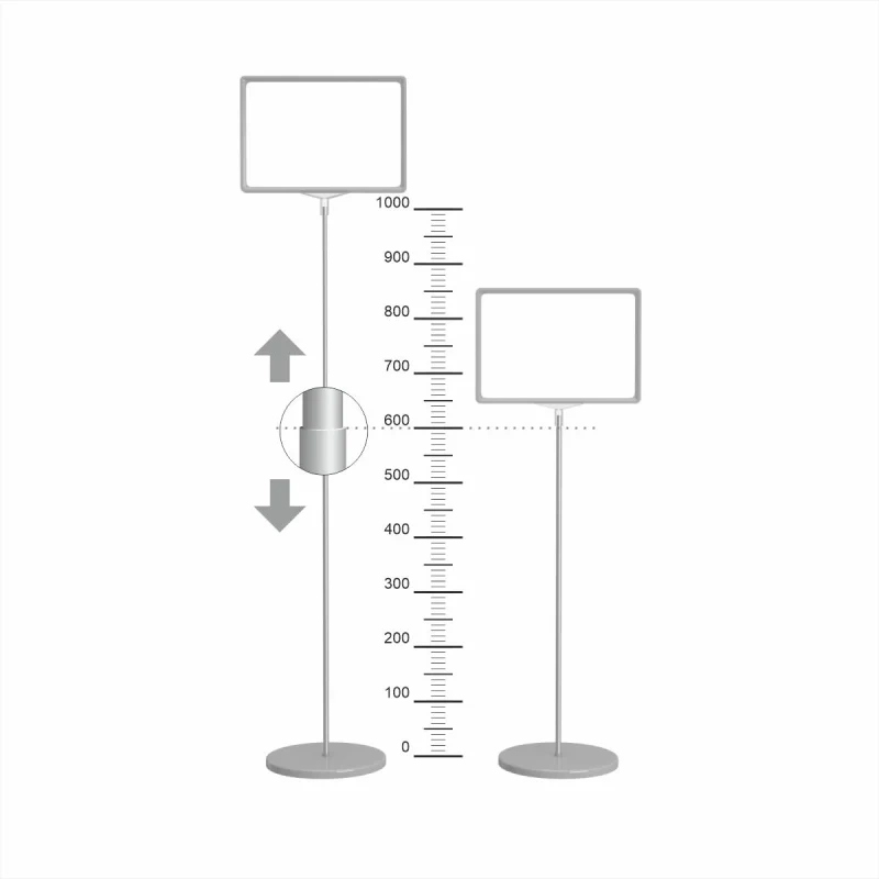 Раздвижная ножка с фиксацией от 60 до 100 см. Максимальная высота стойки с вертикальным расположением рамки А4-130 см. Минимальная высота стойки с горизонтальным расположением рамки А4-81 см.