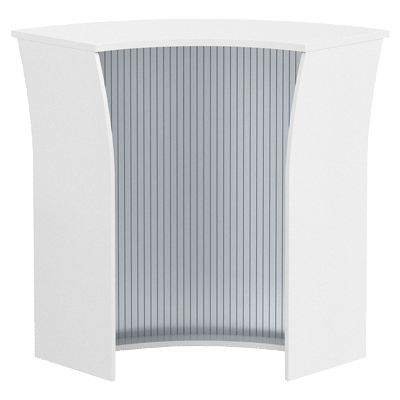 Универсальная стойка ресепшн угловая IMAGO 93,5х93,5 для пользования в сфере услуг и продаж и офисного размещения, размеры - 935х1150х935 мм, цвет - Белый. Солидная и прочная столешница 22 мм, надежная толщина опор - 18 мм. Цвет столешницы и опор - белый, фронтальная панель - роллетное полотно.