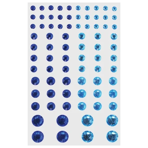 Качественный клеевой слой обеспечит надежную фиксацию на любых поверхностях. Легко отделяются от подложки. Изготовлены из пластика на основе акрила. Стразы представлены в 4 размерах: диаметром от 6 до 15 мм. Имеют круглую форму и выполнены в завораживающих синем и голубом цветах. Предназначены для детей от 3 лет. Поставляются в пакете с европодвесом. В упаковке - 80 страз, размер ассорти. Общий вес - 100 г.