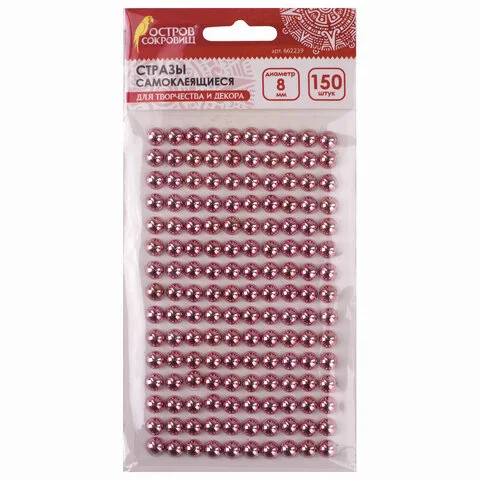 Стразы самоклеящиеся КРУГЛЫЕ, 8 мм, 150 штук, розовые, на подложке, ОСТРОВ СОКРОВИЩ, 662239