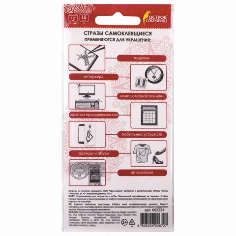 Благодаря качественному клеевому слою, стразы надёжно держатся на любых видах поверхности: бумага, картон, пластик, дерево и т.д.