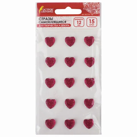 Стразы самоклеящиеся 'СЕРДЦА', 12 мм, 15 штук, малиновые, на подложке, ОСТРОВ СОКРОВИЩ, 662234
