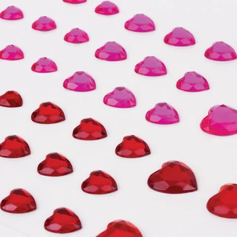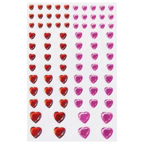 Качественный клеевой слой обеспечит надежную фиксацию на любых поверхностях. Легко отделяются от подложки. Изготовлены из пластика на основе акрила. Имеют форму сердец и выполнены в 2 завораживающих цветах: розовом и красном. Предназначены для детей от 3 лет. Поставляются в пакете с европодвесом. В упаковке - 80 страз размером от 6 до 15 мм. Общий вес - 100 г.