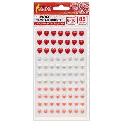 Стразы самоклеящиеся 'Сердце', ассорти, 8-10 мм, 85 шт., на подложке, ОСТРОВ СОКРОВИЩ, 661572