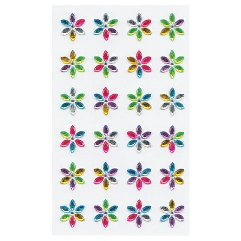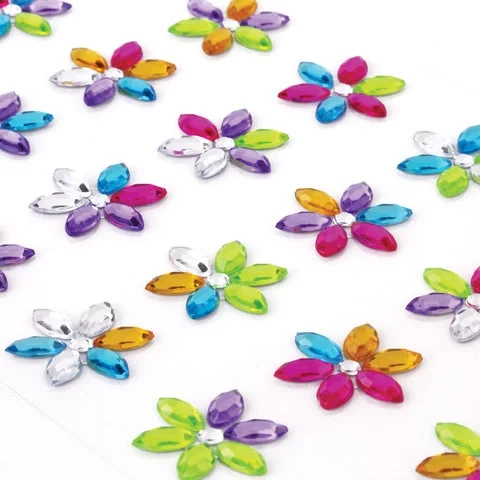 Качественный клеевой слой обеспечит надежную фиксацию на любых поверхностях. Легко отделяются от подложки. Изготовлены из пластика на основе акрила. Имеют форму цветов и выполнены в завораживающих радужных оттенках. Предназначены для детей от 3 лет. Поставляются в пакете с европодвесом. В упаковке - 24 стразы, размер 20 мм. Общий вес - 100 г.