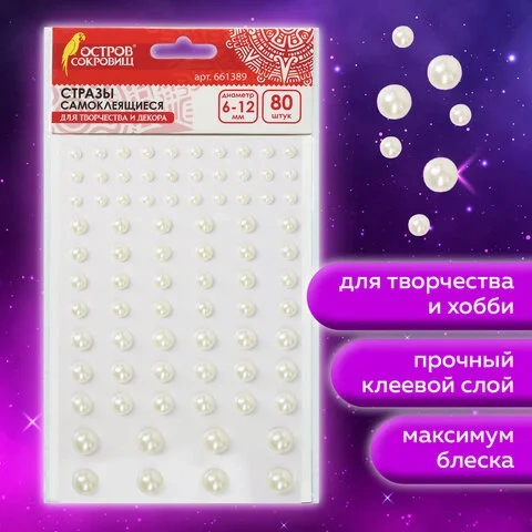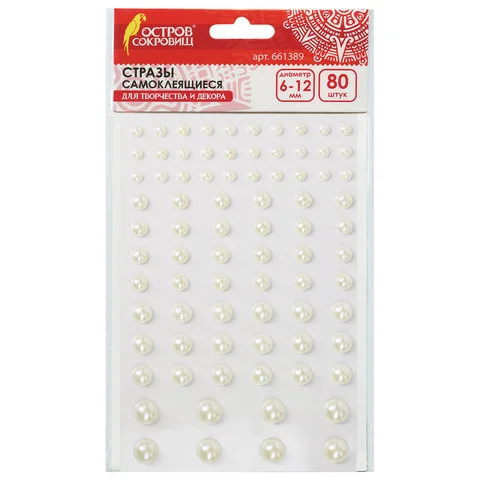 Стразы самоклеящиеся 'Жемчуг', 6-12 мм, 80 шт., на подложке, ОСТРОВ СОКРОВИЩ, 661389