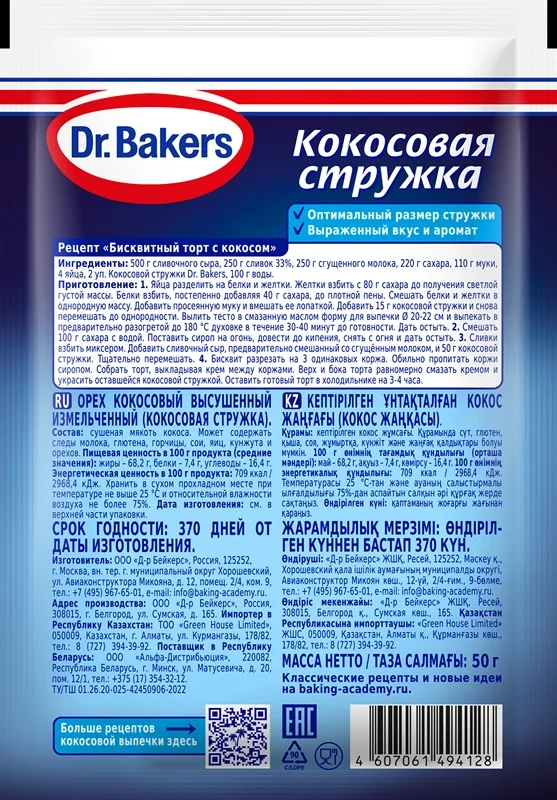 Стружка кокосовая Dr.Bakers для выпечки и декора, 50г