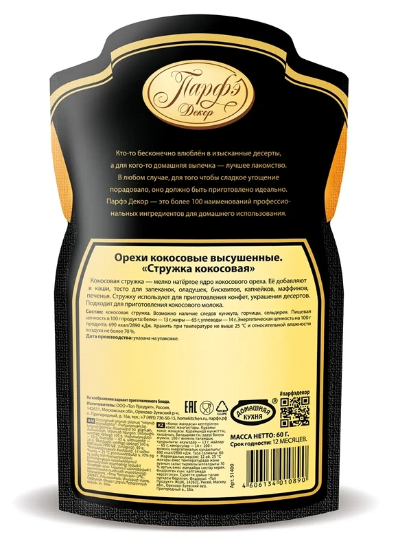 Кокосовая стружка Парфэ произведена из органического сырья и используется для приготовления вегетарианских блюд, украшения вафель, тонких блинчиков, кексов и оладьев, а также применяется в качестве декора домашних конфет. Продукт может комбинироваться с крупяными кашами, медом, сухофруктами и добавляться в любое тесто. Посыпка полностью сохраняет форму после термической обработки и придает блюдам насыщенный аромат и ореховый вкус. Кокос является полноценным источником полезных растительных жиров, натуральных антиоксидантов и минеральных веществ, необходимых для улучшения состояния кожи, волос, нормализации функционирования всех систем организма.