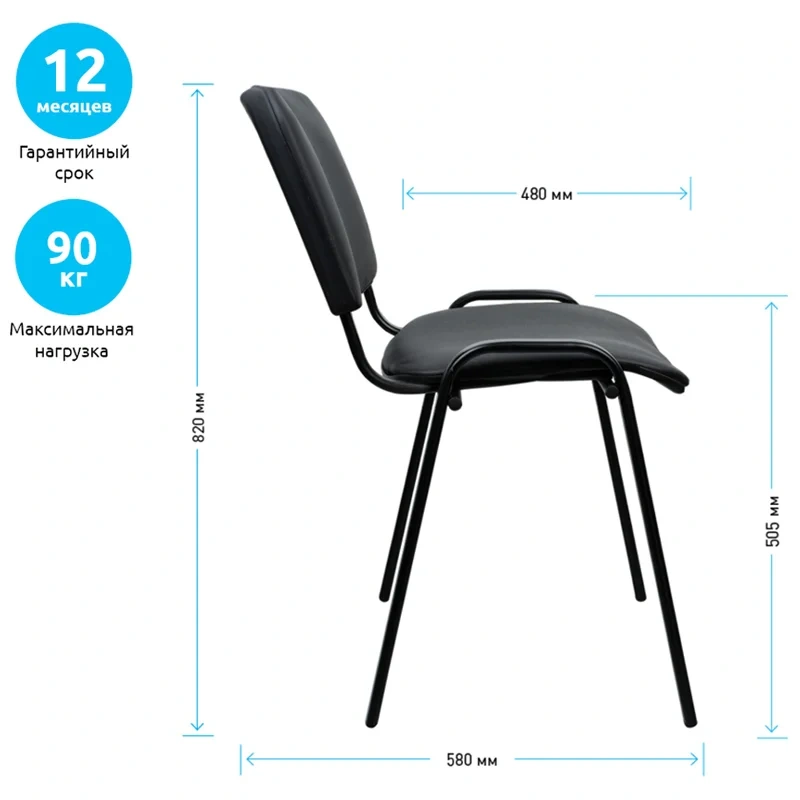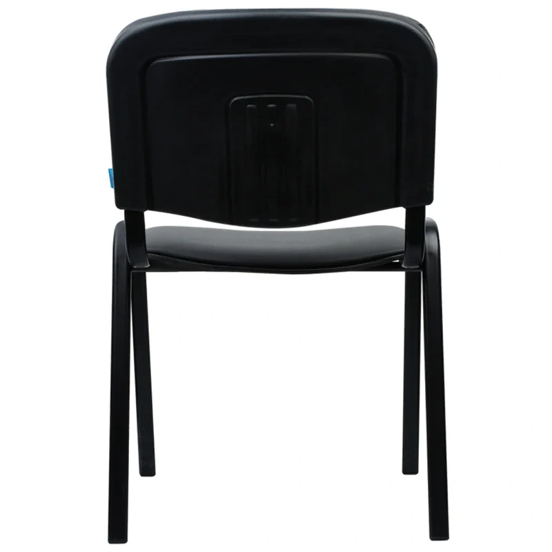 Набивка – высокоупругий поролон. Каркас – устойчивая металлическая конструкция. Ножки и дуги – плоскоовальная труба сечением 30х15 мм и толщиной стенок – 1,2 мм. Покрытие рамы – термореактивная порошковая краска чёрного цвета, стойкая к царапинам и сколам. На ножках есть пластиковые заглушки. Спинка сзади и сиденье снизу закрыты пластиковыми чехлами. Стул подходит не только для офисных помещений, но и для заведений общественного питания, гостиниц, конференц-залов или как компьютерный стул для дома. Конструкция каркаса позволяет убирать стулья в стопки для экономии пространства.