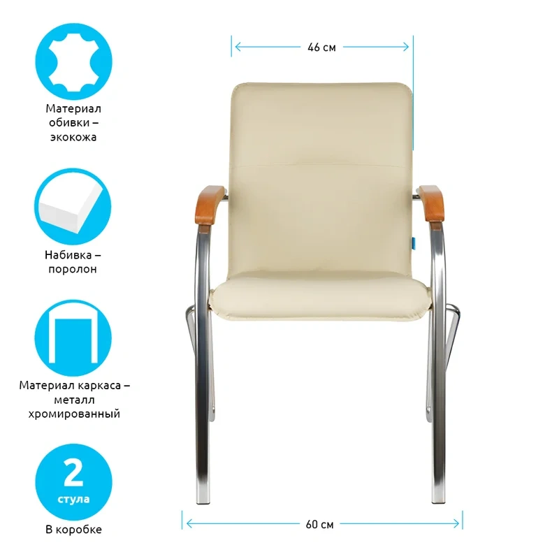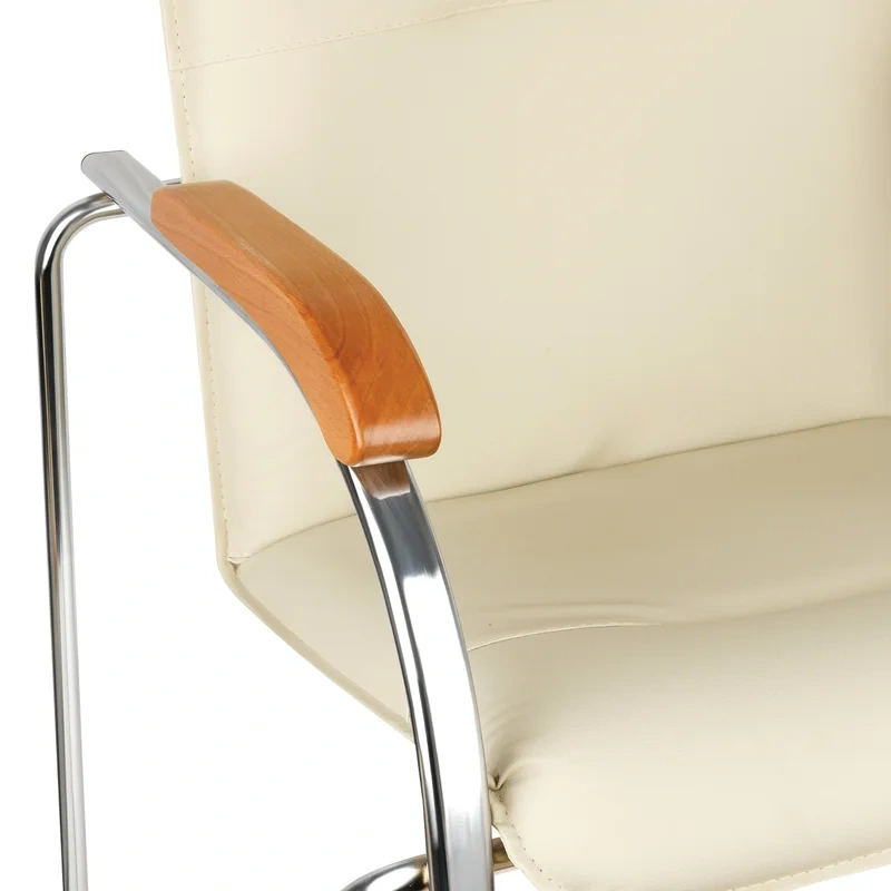 Универсальность модели стула для посетителей Helmi HL-F03 «Самба» в ее безупречной сочетаемости с самыми различными интерьерными решениями. Мягкое основание стула с монолитным фанерным каркасом на хромированной металлической раме обеспечивает комфорт посетителям и сотрудникам. Модель выполнена из экокожи бежевого цвета. Набивка – высокоупругий эластичный поролон. Подлокотники с деревянными накладками классического цвета «бук» добавляют особого лоска офисному стулу. Поставляются по 2 штуки в коробке.