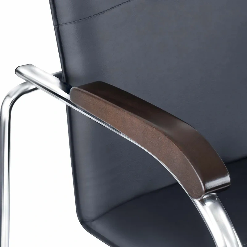 Стул для посетителей Helmi HL-F05 «Самба CT» – стильная и удобная модель со столиком. Стул станет отличным дополнением любого современного офиса, предназначен для эксплуатации в заведениях общественного питания, гостиницах, конференц-залах, а также в качестве компьютерного стула для дома. Изогнутые спинка и сиденье, монолитный фанерный каркас, простая и легкая конструкция на хромированной металлической раме. Модель представлена в экокоже черного цвета. Набивка — высокоупругий эластичный поролон. Подлокотники с накладками из натурального дерева, цвет - орех. Стул «Самба CT» имеет пюпитр (столик) с возможностью складывания. Поставляются по 1 штуке в коробке.