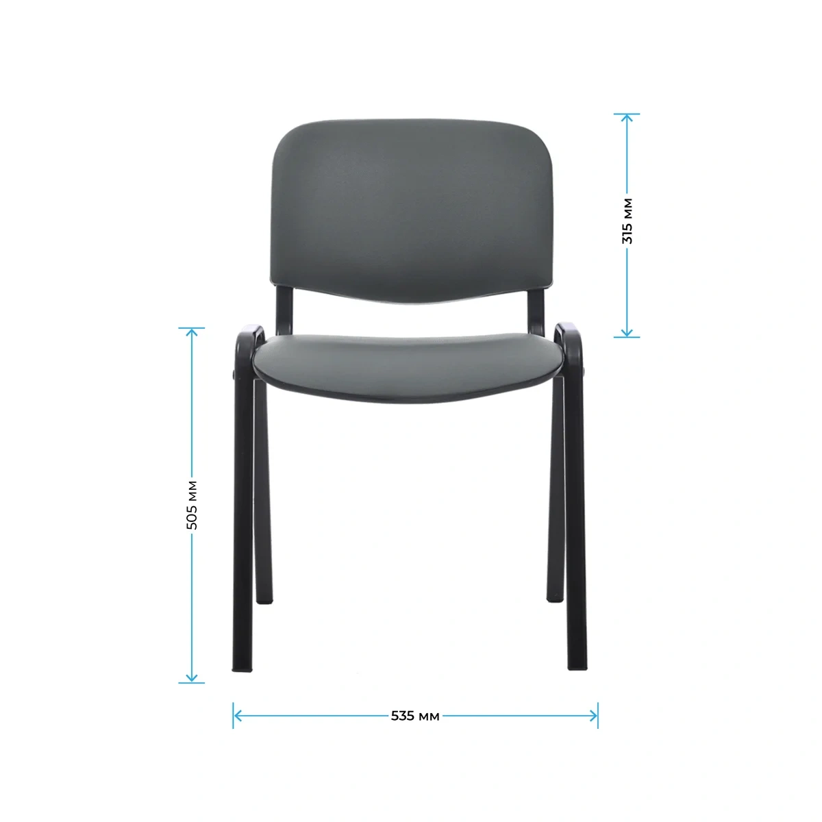 Набивка – высокоупругий поролон. Каркас – устойчивая металлическая конструкция. Ножки и дуги – плоскоовальная труба сечением 30х15 мм и толщиной стенок – 1,2 мм. Покрытие рамы – термореактивная порошковая краска чёрного цвета, стойкая к царапинам и сколам. На ножках есть пластиковые заглушки. Спинка сзади и сиденье снизу закрыты пластиковыми чехлами. Он подходит не только для офисных помещений, но и для заведений общественного питания, гостиниц, конференц-залов или как компьютерный стул для дома. Конструкция каркаса позволяет убирать стулья в стопки для экономии пространства.