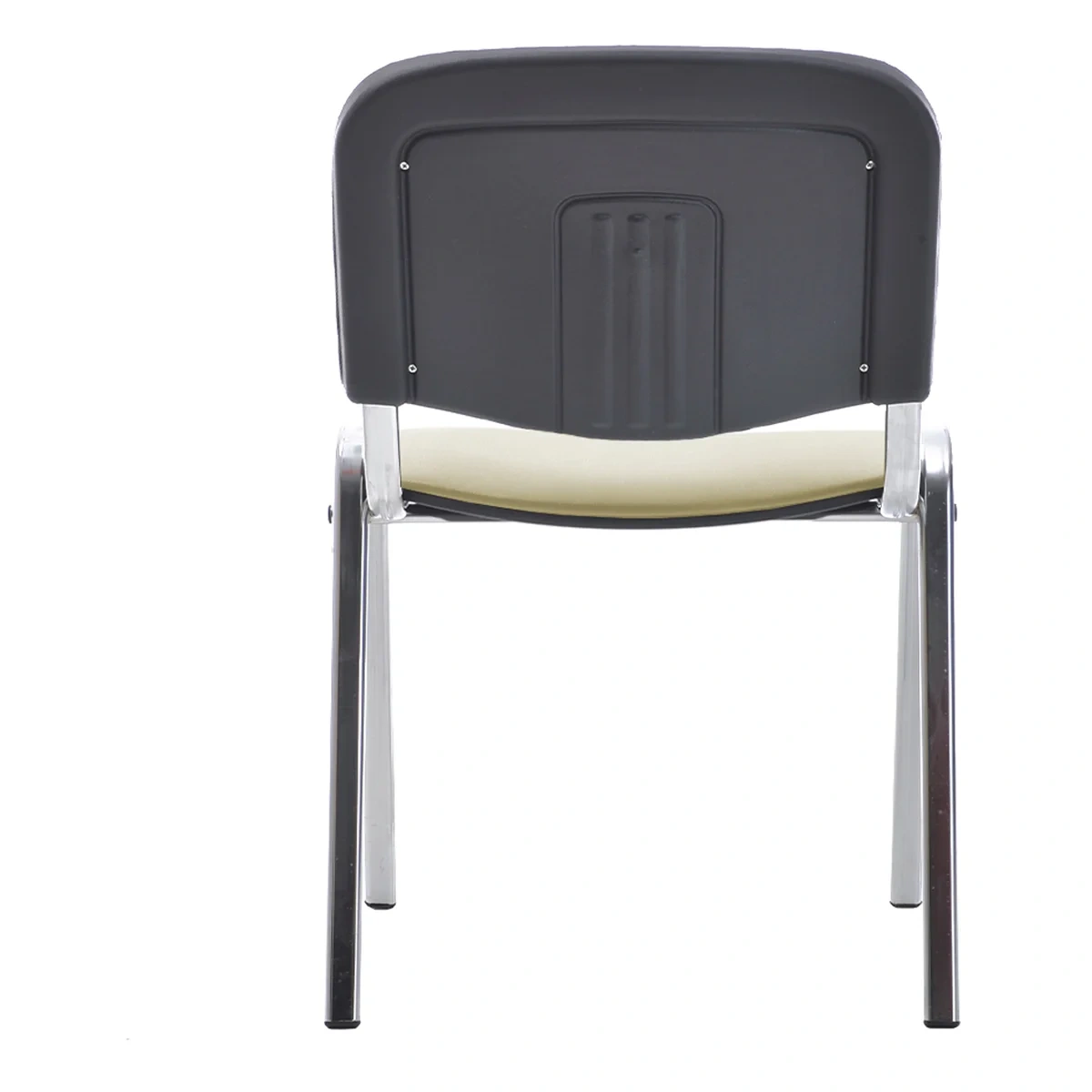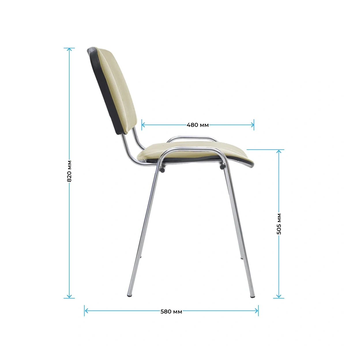 Набивка – высокоупругий поролон. Каркас – устойчивая металлическая конструкция. Ножки и дуги – плоскоовальная труба сечением 30х15 мм и толщиной стенок – 1,2 мм. Покрытие рамы – хром и обладает высокой твердостью и износостойкостью, защищает поверхность металла от коррозии, что способствует увеличению срока службы в несколько раз. На ножках есть пластиковые заглушки. Спинка сзади и сиденье снизу закрыты пластиковыми чехлами. Он подходит не только для офисных помещений, но и для заведений общественного питания, гостиниц, конференц-залов или как компьютерный стул для дома. Конструкция каркаса позволяет убирать стулья в стопки для экономии пространства.