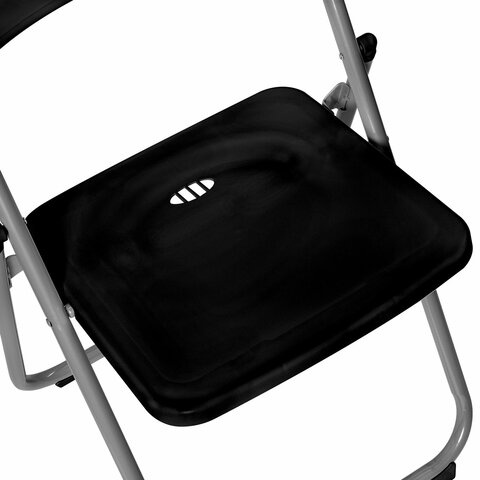 Спинка и сиденье выполнены из прочного полипропилена. Складная конструкция сэкономит место при перевозке и хранении. Прочная стальная рама обеспечит долговечность эксплуатации, а пластиковые насадки на ножках не дадут испортить напольное покрытие. Стул способен выдерживать нагрузку до 110 кг.