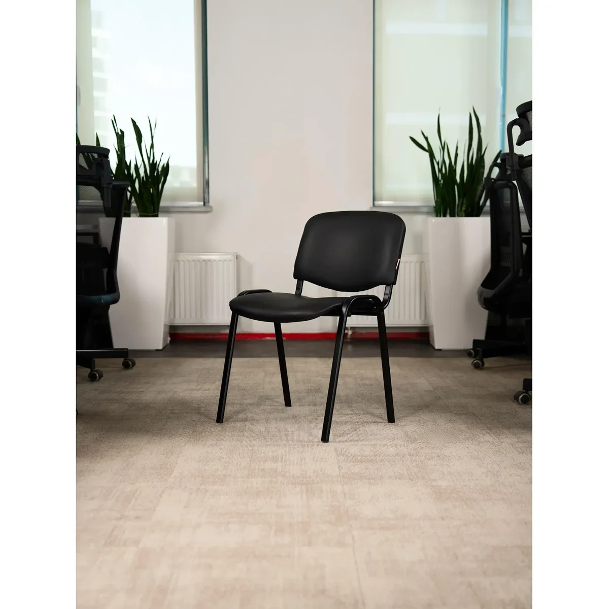 Стул офисный Изо с сиденьем и спинкой, обивка из высококачественной искусственной кожи. Каркас выполнен из металла с износостойким напылением черного цвета. Ножки стула снабжены накладками для сохранности напольного покрытия. Задняя часть спинки сделана из пластика черного цвета.