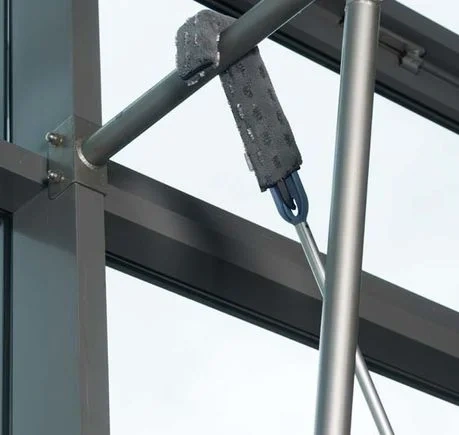 Полиамидный оконный скребок с фиксированной ручкой, оснащенный блокирующим рычагом и системой крепления Lampo, а также направляющей с заменяемым лезвием. Предназначен для систем очистки стекла с флисом и скребком. Идеально подходит для профессионального использования.