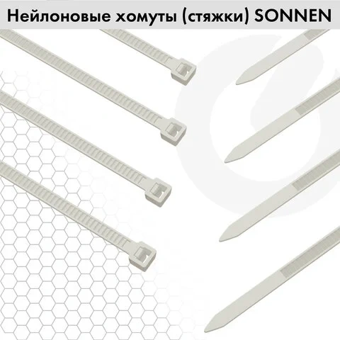 Стяжки (хомуты) нейлоновые SONNEN обеспечивают надежное, быстрое и экономичное крепление. Они просты и удобны в использовании: большим пальцем левой руки прижмите замок к пучку, а правой рукой затяните петлю, вставьте конец затяжки в замок и затяните до полной фиксации, после чего отрежьте выступающую часть бандажа. Не рекомендуется перегибать бандаж при затяжке.