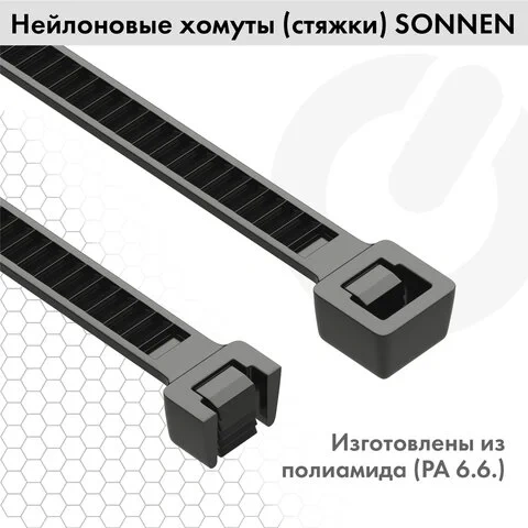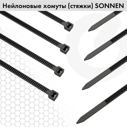 Стяжки (хомуты) нейлоновые SONNEN обеспечивают надежное, быстрое и экономичное крепление. Они просты и удобны в использовании: большим пальцем левой руки прижмите замок к пучку, а правой рукой затяните петлю, вставьте конец затяжки в замок и затяните до полной фиксации, после чего отрежьте выступающую часть бандажа. Не рекомендуется перегибать бандаж при затяжке.