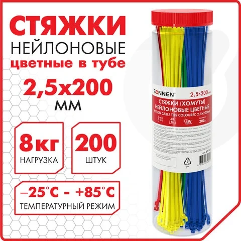 Стяжки (хомуты) нейлоновые сверхпрочные ЦВЕТНЫЕ в тубе 2,5х200 мм, КОМПЛЕКТ 200 шт., SONNEN, 607925