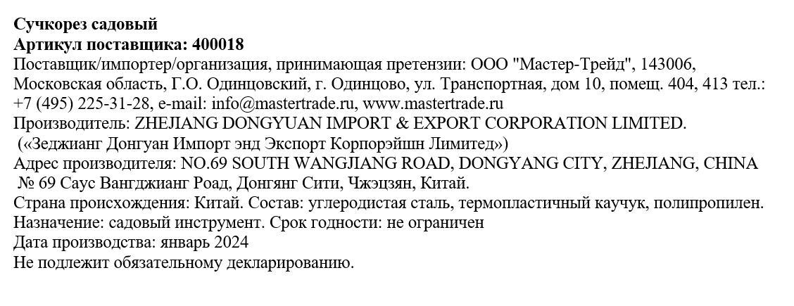 | Комплектация | сучкорез - 1 шт. |