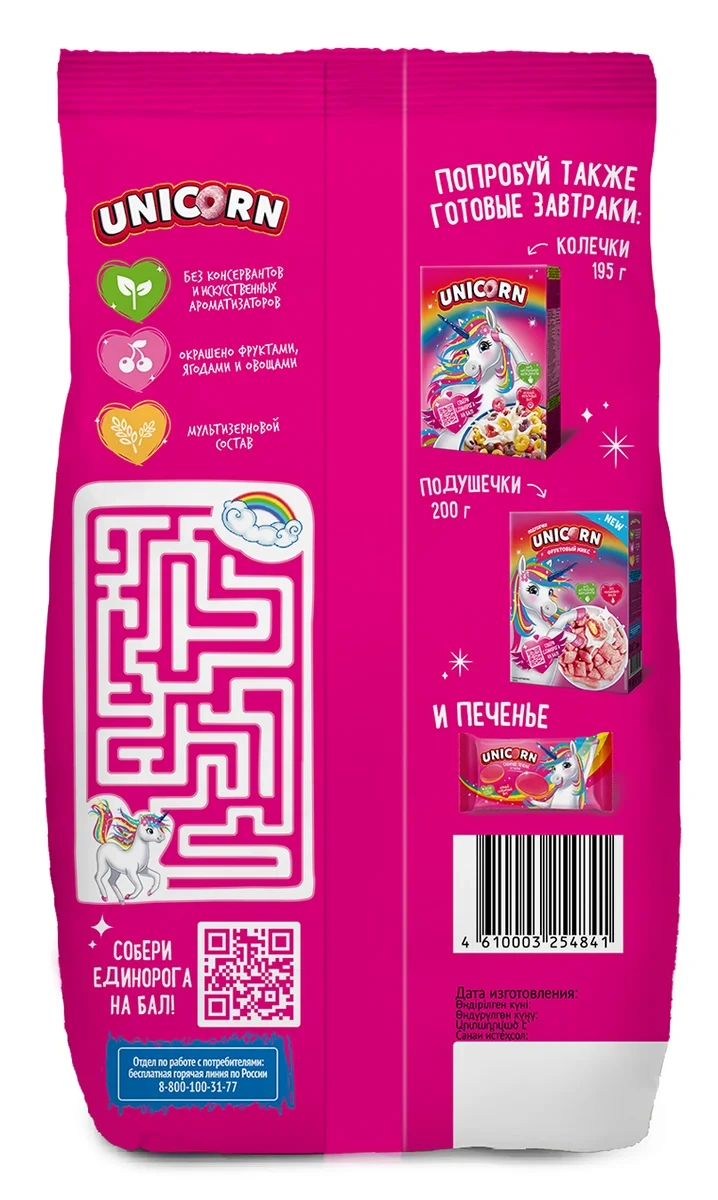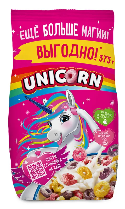 Готовый завтрак Unicorn Радужные колечки с фруктовым вкусом цельнозерновые, 375г
