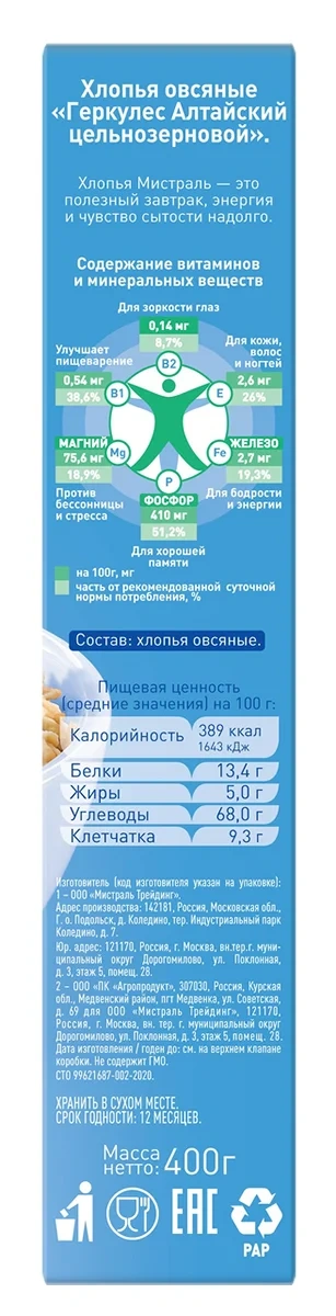 Хлопья Мистраль Геркулес алтайский, 400г