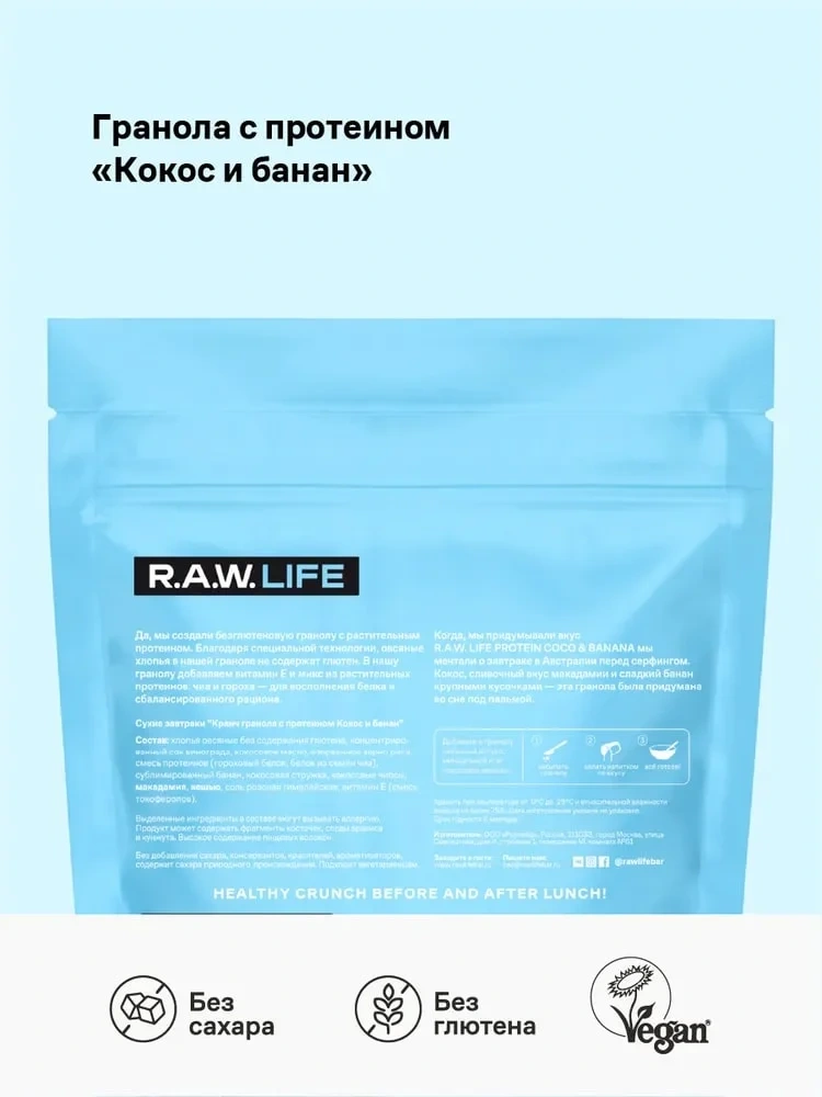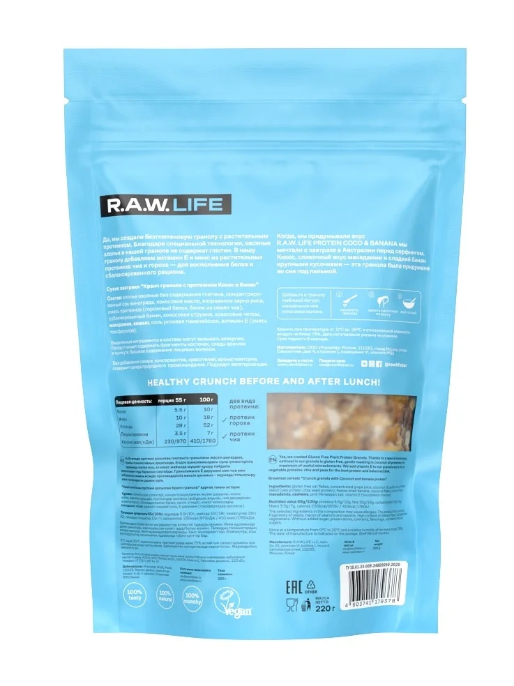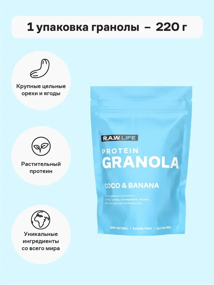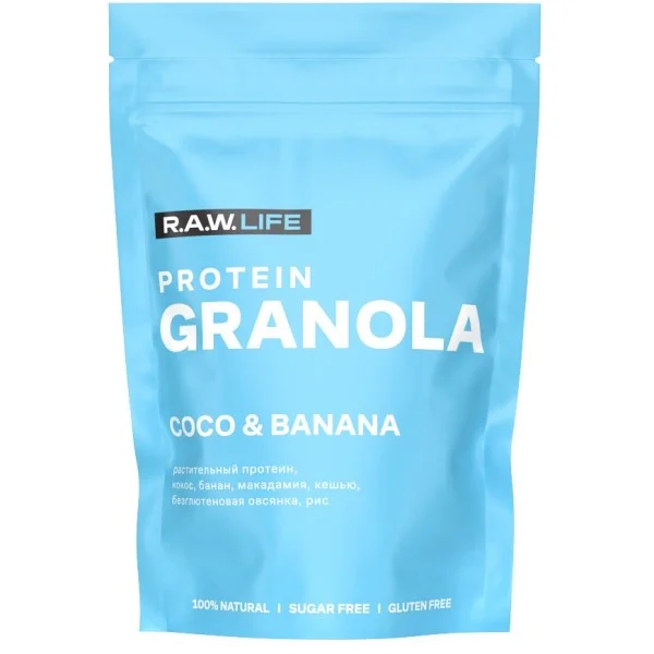 Гранола R.A.W. Life протеиновая кокос-банан, 220г