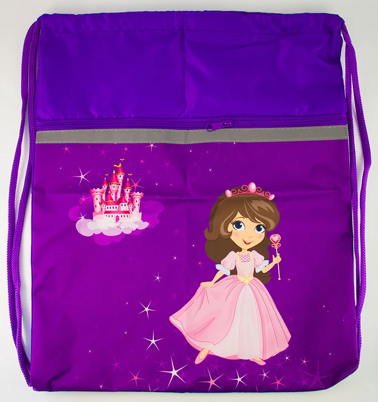 Сумка для обуви Silwerhof 'Принцесса' предназначена для хранения и переноски спортивной одежды и сменной обуви. Красочная и вместительная сумка для обуви подходит для обуви любого размера и затягивается шнурками, дополнительно выполняющими функцию лямок, что с легкостью позволяет ее использовать в качестве небольшого рюкзака. Изделие изготовлено из полиэстра с использованием светоотражающих материалов, декорировано ярким принтом. Имеет одно отделение и карман на молнии, размер 41x49см.