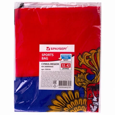 Сумка-мешок на завязках 'Триколор РФ', с гербом РФ, 32х42 см, BRAUBERG, 228328, RU37