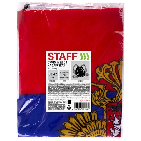Затягивается двумя шнурками. Выполнена из полиэфирного шелка в цветах флага Российской Федерации с изображением герба. Упакована в пакет, который сохранит качество и товарный вид при хранении и транспортировке. Размер - 32х42 см.