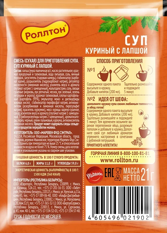 Можно взять удобный пакетик с куриным супчиком и лапшой с собой на работу. Готовится он легко – залил кипятком, несколько минут и готово! Легкий обед можно устроить в любой момент. Альтернатива горячему обеду в походных условиях. Одной пачки супа Роллтон достаточно для сытного перекуса. Достоинством продукта также является простота в приготовлении.