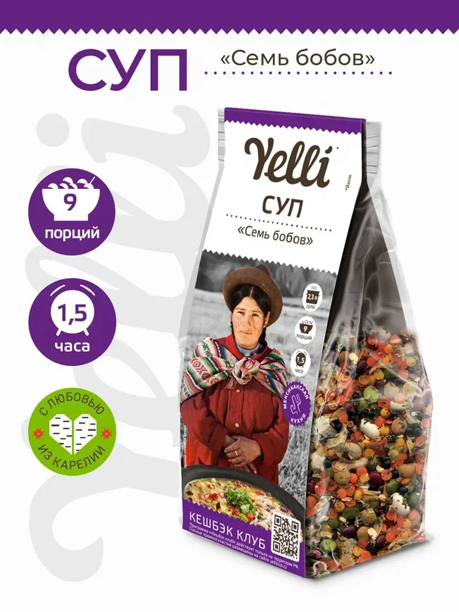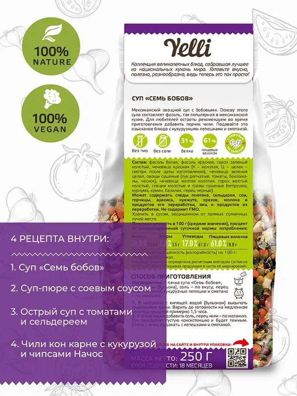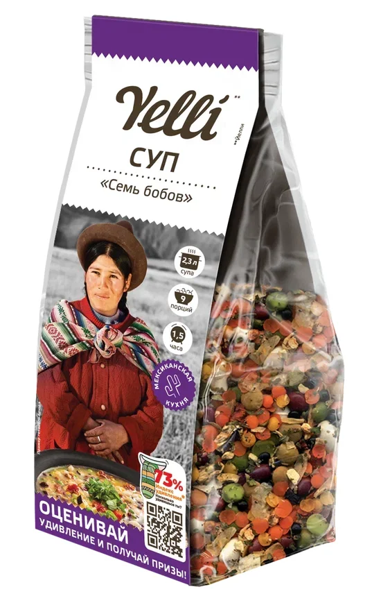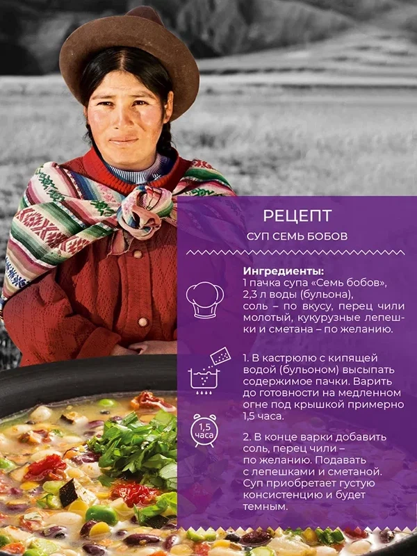 Суп Семь бобов — это высококачественная готовая смесь для создания широко известного в Европе первого блюда, которое подают со специальным соусом или сметаной. Основой продукта являются несколько видов фасоли и чечевицы, содержащие широкий спектр полезных веществ и витаминов, необходимых для сытного обеда и продуктивного продолжения рабочего дня. Одной упаковки хватит на 4 порции ароматного и вкусного супа, который удовлетворит потребности самых искушенных гурманов.