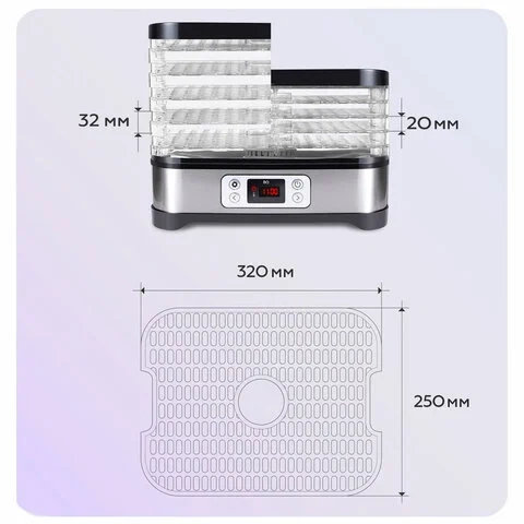 Мощность сушилки составляет 250 Вт, а диапазон температур сушки – от 35 до 70 °С. Благодаря встроенному вентилятору и конвекции продукты сушатся быстро и равномерно.