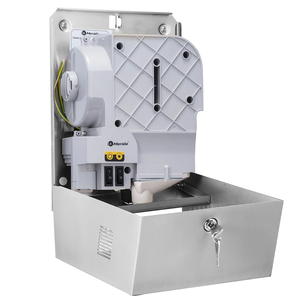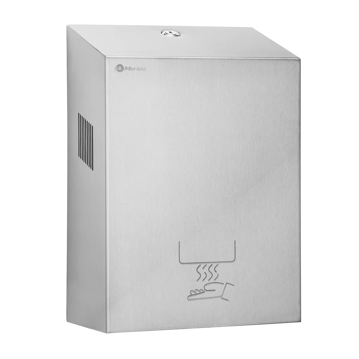 Электросушилка для рук 'MERIDA STELLA R' (матовая нержавеющая сталь, 1200 Вт) Электросушилка 'MERIDA STELLA R' из матовой нержавеющей стали обеспечивает быстрое и эффективное высушивание рук за 7–10 секунд благодаря мощному потоку воздуха со скоростью 342 км/ч. Она оснащена щеточным мотором, который обеспечивает долгий срок службы, и системой защиты от перегрева при достижении температуры 95°C. Сушилка имеет низкий уровень шума — от 65 до 75 дБ, что делает её комфортной в использовании в общественных местах. Пыле- и влагозащищённость IPX1 позволяет использовать устройство во влажных помещениях. Преимущества: Сушка рук за 7–10 секунд благодаря мощному воздушному потоку. Матовая нержавеющая сталь устойчива к коррозии и легко чистится. Щеточный мотор гарантирует надёжную работу и долговечность. Низкий уровень шума (65–75 дБ) делает устройство удобным для использования в общественных местах. Пыле- и влагозащищённость IPX1 подходит для использования во влажных помещениях. Защита от перегрева (при тем Уход: Для регулярной гигиены поверхности используйте очиститель-полироль CEMO. Нанесите средство на протирочную салфетку CM002 и аккуратно протрите поверхность для поддержания чистоты и сохранения внешнего вида.