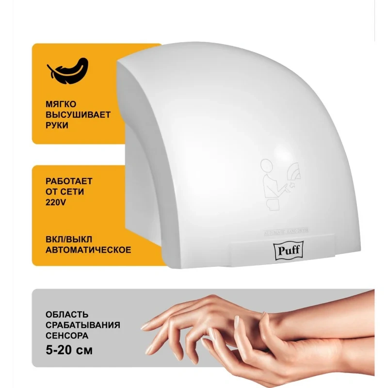 Сушилка для рук Puff 8820, 2000Вт, пластик, 240*230*240мм, белый