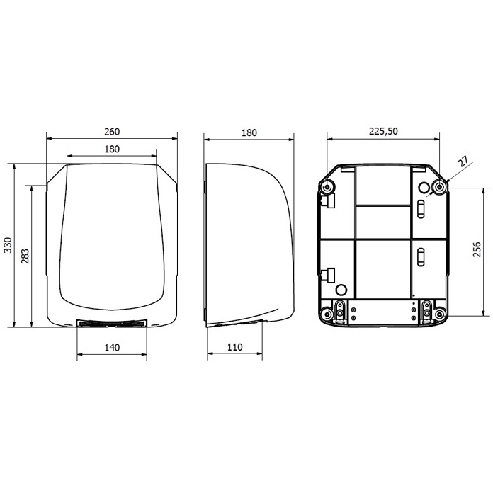 Настенная сушилка рук для общественных мест с малой и средней проходимостью. Надежный двигатель средней мощности, не турбированный. В прочном металлическом анивандальном корпусе. Качественная сборка от испанского производителя Jofel, линейка - AVE Стильный внешний вид.