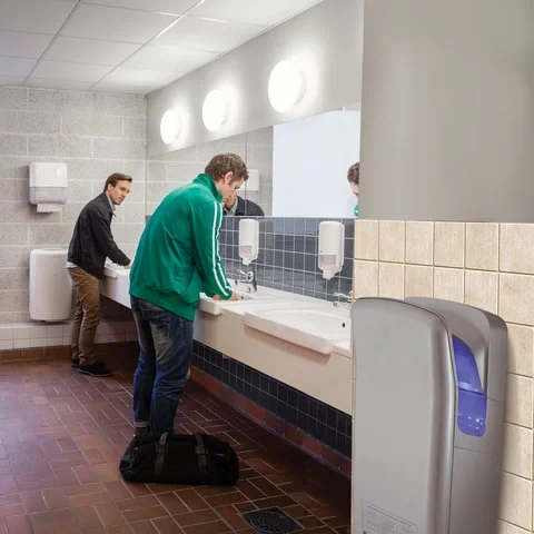 Руки становятся сухими за 6-8 секунд. Такой результат достигается благодаря высокой скорости воздушного потока и уникальной технологии подачи воздуха. Мощный двигатель создает поток воздуха скоростью до 95 м/с, который разделяется на две плоских струи так, что он фактически сдувает капли воды с рук за считанные секунды!