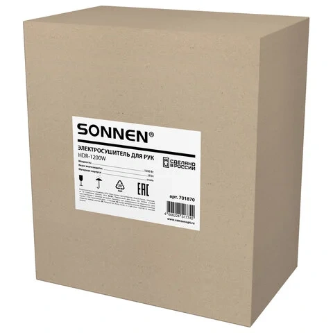 Сушилка для рук SONNEN HDR-1200W, 1200 Вт, производство РОССИЯ, антивандальная, 12 м/с, сталь, 70187