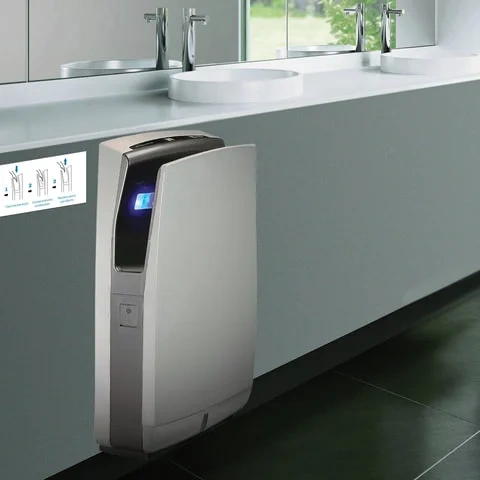 Мощность 1650 Вт обеспечивает время сушки рук за 10 секунд. Мощный поток воздуха подается на руки из тонких форсунок с двух сторон, в результате чего создается эффект срезания капель воды, и руки становятся сухими за несколько секунд, что обеспечивает максимальный уровень комфорта для пользователя. Данную модель отличает наивысший для подобного типа устройств класс влагозащиты – IPX4, что означает, что устройство защищено от брызг с любых сторон. Это полностью исключает вероятность короткого замыкания из-за попадания воды на корпус. Устройство оснащено каплесборником для получаемой после сушки рук воды и воздушным фильтром для очистки подаваемого воздуха. Корпус изготовлен из нержавеющей стали и ударопрочного пластика, что обеспечивает повышенную антивандальную безопасность устройства. В комплект поставки входит набор для крепления к стене.