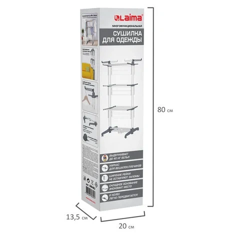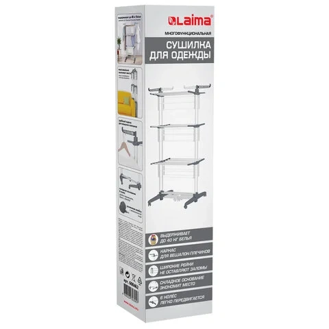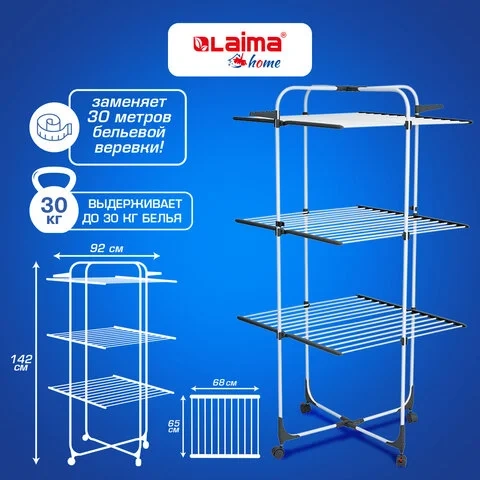 Сушилка напольная для белья раскладная, 3 уровня, 30 метров, на колесах, LAIMA HOME HIGH-RISE, 70047