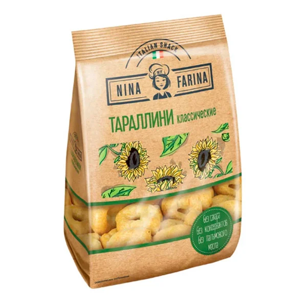 Тараллини Nina Farina классические 180 г – это миниатюрные рассыпчатые сушки. В составе тараллини (итальянские сушки диаметром 25 мм) только натуральные ингредиенты: мука высшего сорта, подсоленная вода, капля алкоголя и высокоолеиновое подсолнечное масло. Итальянская сушка не содержит сахара, чего не скажешь о ее русской родственнице. В составе тараллини нет пальмового масла и консервантов. Тараллини - вкусный и полезный перекус для любителей похрустеть любого возраста.